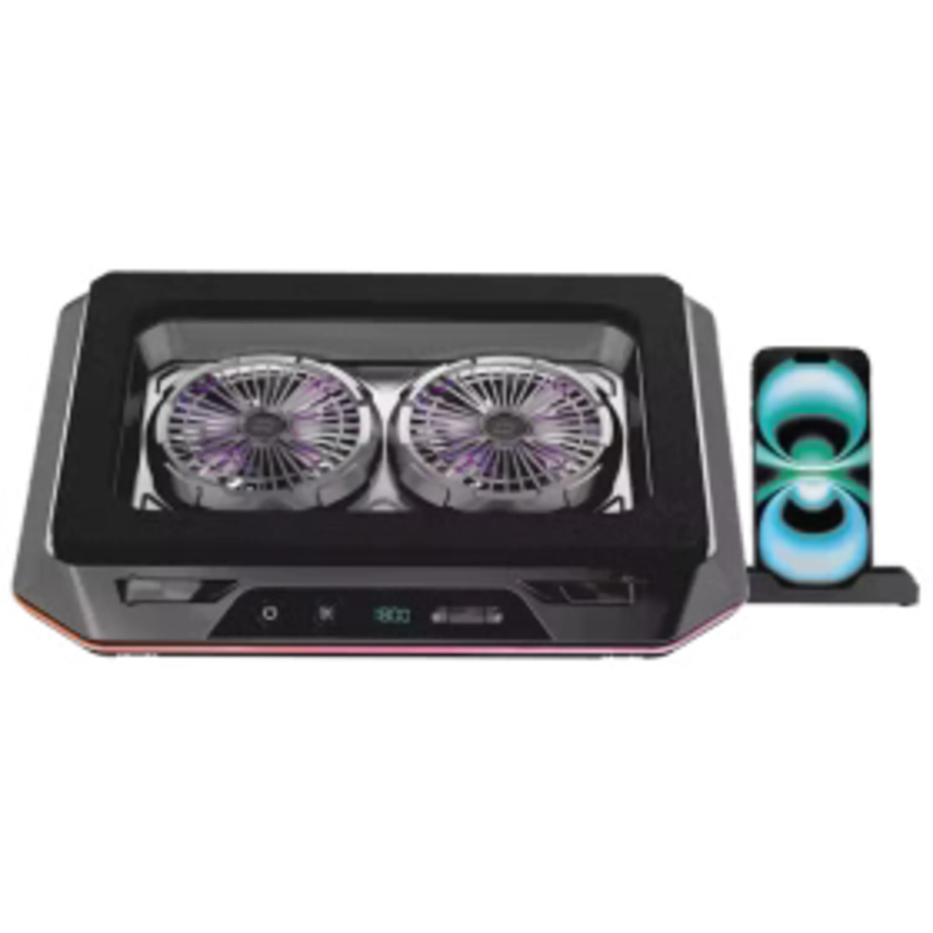 "Dual-Fan Gaming Cooling Pad with Large Fans and Air Pressure Cooling Technology, Adjustable fan speed control for customized cooling., Constructed with a durable plastic body., Equipped with USB and Type-C connectivity., Features an LCD display for fan speed and lighting control., Features large fans and air pressure cooling technology for optimal heat dissipation., Includes a mobile phone stand and 11-mode RGB lighting., Supports laptops up to 17 inches."